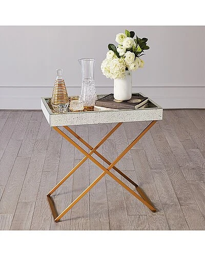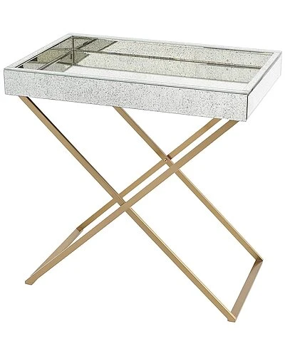 - Design details: functioning folding tray and occasional table with beveled mirror and leather strap stays.