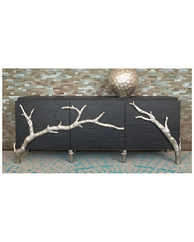- Design details: The Branch Media Cabinet in black is an artistically expressed functional piece of furniture. The face and top are hand planed with a carved fluted top edge. The striking branches across the front are cast aluminum and function as legs and pulls. Each of the three doors conceals two adjustable wood shelves. The slat back of the cabinet allows easy access to component wiring and provides ventilation to help keep your audio/video components cooler.