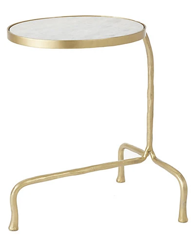 - Design details: Studio A Home’s distinctive cantilevered iron tri-pod table is finished in brass and has a white marble top.