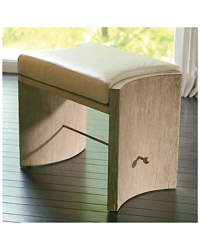 - Design details: This sophisticated bench has a dramatically curved American Oak base with a brass stretcher for support. The shaped box cushion is in ivory top grain cowhide leather with baseball stitching and a bottom vent panel.