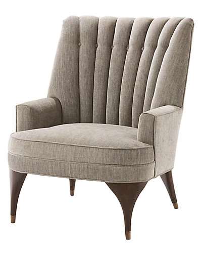 - Design details: A delicate pale grey woven fabric covers the surface of the chair. The back is channel tufted with inset buttons buried deep within the channels. A tight seat and exterior back make for a clean, comfortable seat. The oiled walnut finished rubberwood legs are capped with solid antique brass sabots on all four legs. The leg detail and shape add that extra level of interest such a beautiful chair requires.