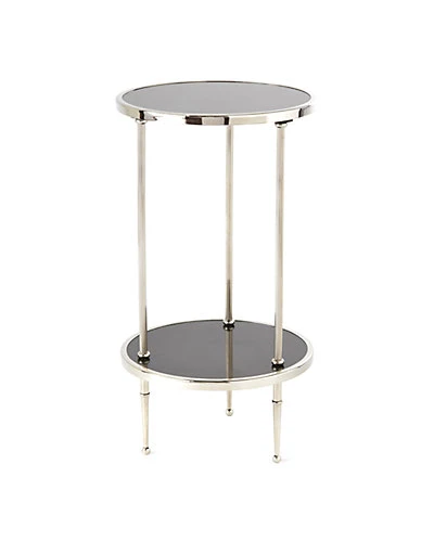 - Design details: Dainty and demure, but with amazing placement potential, our Petite 2-Tiered Table provides just enough surface space to display your favorite odds and ends. The polished nickel frame gleams against the black granite tops.