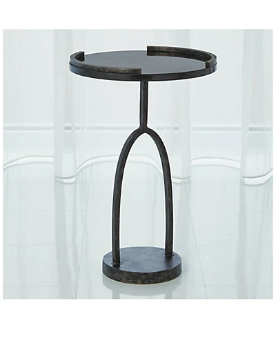 - Design details: This hand-forged iron accent tables sports an inset black granite top and a wishbone-shaped base for good luck.