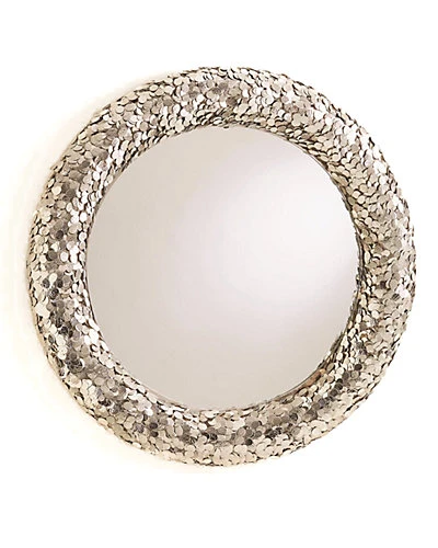 - Design details: Hundreds of hand-attached, hand-hammered, nickel plated iron discs form the frame of this statement piece round mirror. The discs are supported by an iron cage surrounding the frame. Hangs from a cleat.